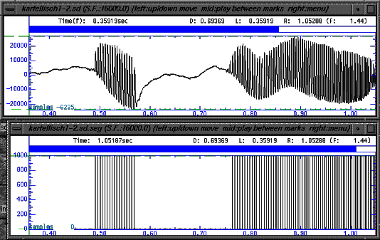 Further processing involves an analysis within voiced segments. The intervals between marked minimum-maximum pairs are compared in order to detect deviations from mean interval duration and mean relative amplitude. If the deviations are greater than the given thresholds, the weaker pairs are connected to stronger ones (provided that the resulting pair does not exceed the allowed pitch range).